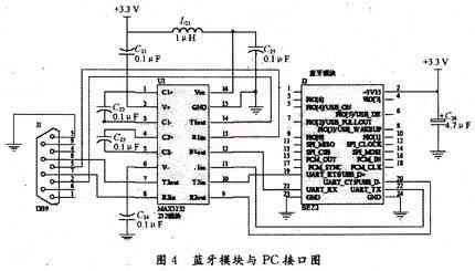 接收模块与监控PC机连接,用来接收从采集模块发送过来的蓝牙ACL数据包,并将之传送到PC。蓝牙模块与PC机的通信是基于HCI RS 232接口,使用了一片电平转换芯片MAX3232将TTL电平转换成RS 232电平,实现了利用PC机串口与蓝牙模块通信,进行数据收发的功能,如图3所示。