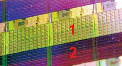 值得指出的是,3D二次集成电路技术也是高性能阵列处理器中所要用的技术。例如,Intel提出了一个名叫Tera-Scale的计划,2007年初采用65nm工艺,总共集成了1亿(100 Million)晶体管,一共采用了80个比现代处理器简单的处理元PE。PE阵列与SRAM存储器阵列的互连也是采用3D 二次集成电路技术实现的,如图4所示,Intel阵列处理器的性能,如表1中所示,每个芯片都达到了每秒1万亿次的水平。