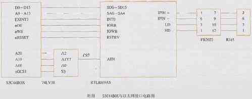 本方案硬件电路使用的芯片主要有微处理器S3C44BOX、RTL8019AS、74LV138和FB2022(网卡变压器),其硬件框图如附图所示。处理器S3C44BOX与RTL8019AS的接口采用UTP RJ-45接口。RTL8019AS与主机有三种接口工作模式: