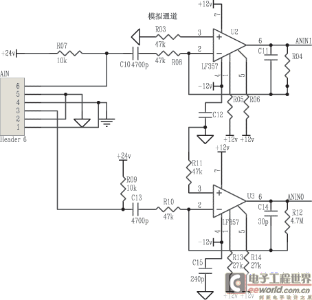 AIN为传感器的接入插座。电阻R04和R08,R12和R10分别与LF357构成反向比例放大电路,将传感器弱电信号放大到CPU可以处理的信号。R03和R11为此放大电路的匹配电阻,阻值的计算公式为R03=R04//R08,R11=R12//R10。C10和C13为隔直电容,C11和C14为滤波电容用来滤除信号中的噪声。