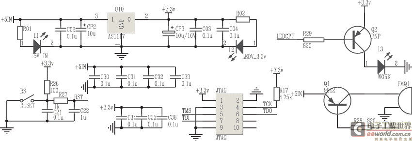 U10为1117用来实现将5V输入变成3.3V输出。L3为工作状态指示灯。FMQ1为蜂鸣器。C30~C36为去偶电容。R26、R27、C21和C22构成上电和按键复位电路。L1、L2为电源指示灯。JTAG则为JTAG调试端口。