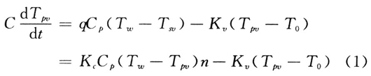 室内要求控制的到的温度设定为Tsv,风箱出口温度为Tw,当前室内环境温度的测量值为Tpv,室外的温度为T0,室内的散(吸)热系数为Kv,比热容为C,由风机转动而产生的空气流量为q,其比热容为Cp,流量q正比于风机的转速n,其比例系数为Kc,根据动态能量平衡原理,可得:
