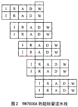 RM7000A包含一条5阶超标量指令流水线(度m=2),供M-pipe和F-pipe使用。每条指令被划分为5个子过程:I为取指令,R为取寄存器数,A为执行,D为取数据,W为写回,如图2所示。