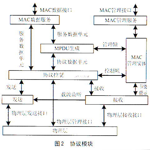 *协议控制模块:完成DCF、PCF下的各种协议控制功能,包括RTS/CTS、ACK、ATIM、CF-ACK等,并根据信道状态请求退避,在传送数据挫败后控制重传等。该模块还负责对所有接收到的MAC帧进行分类,按不同的类型送到不同的模块进行处理。