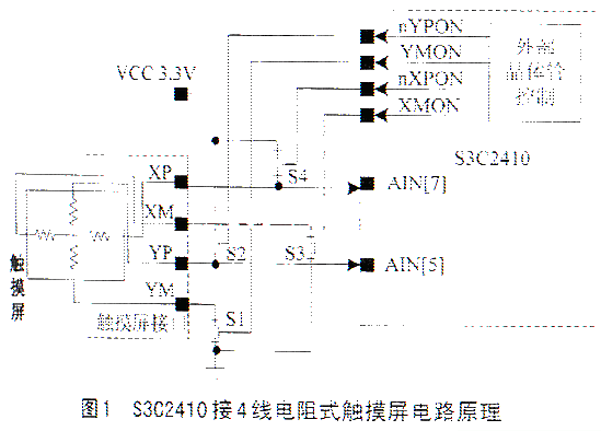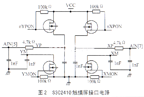 S3C2410接4线电阻式触摸屏的电路原理如图1所示。整个触摸屏由模向电阻比和纵向电阻线组成,由nYPON、YMON、nXPON、XMON四个控制信号控制4个MOS管(S1、S2、S3、S4)的通断。S3C2410有8个模拟输入通道。其中,通道7作为触摸屏接口的X坐标输入(图1的AIN),通道5作为触摸屏接口的Y坐标输入(图1的AIN)。电路如图2所示。在接入S3C2410触摸屏接口前,它们都通过一个阻容式低通滤器滤除坐标信号噪声。这里的滤波十分重要,如果传递给S3C2410模拟输入接口的信号中干扰过大,不利于后续的软件处理。在采样过程中,软件只用给特殊寄存器置位,S3C2410的触摸屏控制器就会自动控制触摸屏接口打开或关闭各MOS管,按顺序完成X坐标点采集和Y坐标点采集。