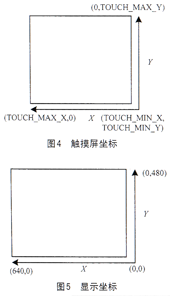 函数Touch_Coordinate Conversion完成触摸屏采样值转换成显示坐标,根据不同的硬件有不同的转换方法。本触摸屏采样坐标及显示坐标如图4、图5所示。其中TOUCH_MAX_X和TOUCH_MIN_X是触摸屏X坐标采样值的最大和最小值;Y坐标同理。可以运行本文程序,同时使用触摸笔在触摸屏的4个角取得最大最小采样值。这里使用的是320%26;#215;240的TFT屏,所以TOUCH_X值为320。下面是X坐标的转换程序: