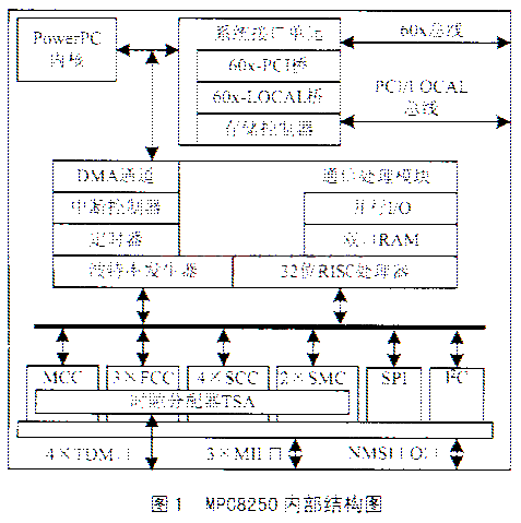 ①PowerPC内核:完成中央处理器的功能,执行高层程序偌,它与SIU和CPM通过独立的指令Cache和数据Cache通信,通过MMU对存储器进行管理。