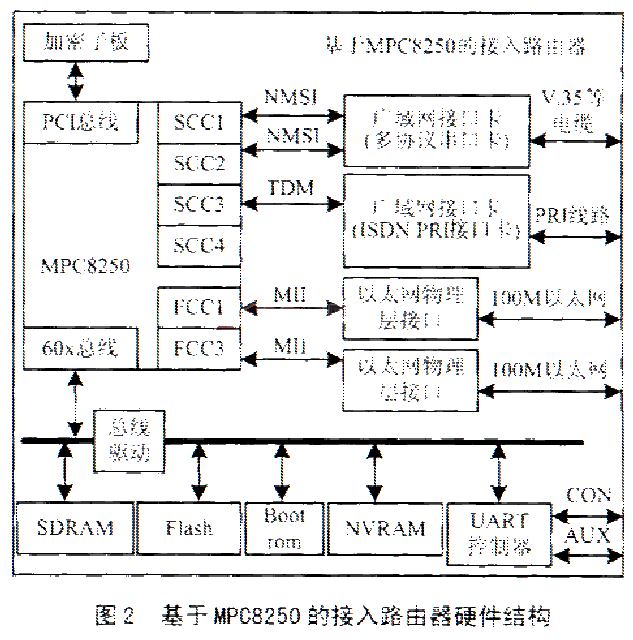 根据上文对接入路由器的功能分析,接入器由器的硬件主要由中央处理器、广域网接口模块、局域网(以太网)接口模块、维护、调试接口模块、内存SDRAM、引导Flash等同部分构成。其中:MPC8250可通过内部集成的FCC支持2个100Mbit/s以太网接口,由于FCC支持标准的MII接口,因此可以直接与以太网的物理层收发器相连接;MPC8250内部集成了PCI总线控制器,可以用于提供与加密模块的接口;同时MPC8250仍然保留了4个SCC,可用于提供广域网接口;由于内部的SMC不提供Modem控制信号,因此为了支持远程拨号维护,扩串口控制芯片;此外,SDRAM、Flash、Bootrom、NVRAM等器件均通过60x总线与MPC8250连接。基于MPC8250的接入路由器内部硬件结构如图2所示。