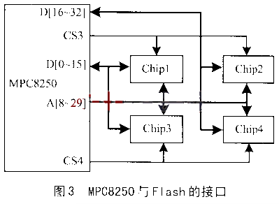 在接入路由器的设计中,要求兼容8/16/32MB不同大小的Flash插卡,即在驱动程序中应能检测出不同大小的Flash插卡,而Flash插槽的数据总线宽度为32位。因此使用4片16位的Flash,以存储器扩展的方式完成MPC8250与Flash的接口设计,如图3所示。