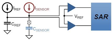 如图1所示,IREF是一个内部参考电流源,CREF是内部集成的充电电容,ISENSOR属于内部集成的受控电流源,CSENSOR为外部电容传感器的充电电容,由于人体的触摸引起CSENSOR的变化,通过内部调整过的ISENSOR对CSENSOR进行瞬间的充电,在CSENSOR上产生一个电压VSENSOR,然后相对内部参考电压经过一个共模差分放大器进行放大;同理IC内部的IREF对CREF充电后也产生一个参考电压并相对同样的VREF经过差分放大,最后将2个放大后的信号通过SAR(逐次逼近模数转换器)式的ADC采样算出ISENSOR的值。