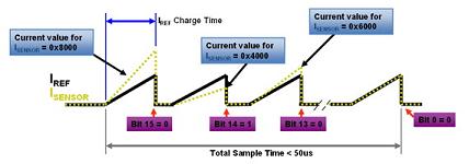 Silicon Labs SAR式的ADC采样可选择12-16位的分辨率,如图2所示,采用16位的分辨率进行逐位比较采样:首先从确定最高位第16位(IREF=0x8000)开始,最高位的值取决于电容的充电速率,也就相当于电流的大小,取电流IREF/2,比较VSENSOR和VREF: