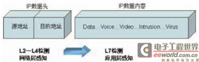 DPI (Deep Packet Inspection),即“深度报文检测”。所谓“深度”是和普通的报文分析层次相比较而言的,“普通报文检测”仅分析IP包的4层以下的内容,包括源地址、目的地址、源端口、目的端口以及协议类型,而DPI 除了对前面的层次分析外,还增加了应用层分析,识别各种应用及其内容,基本概念如图1所示。