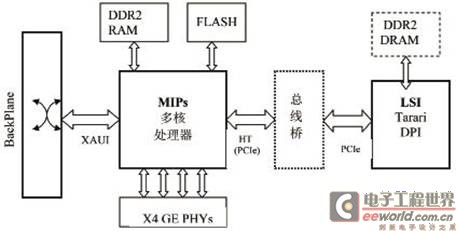以某公司基于MIPs的多核芯片为例,图2所示为Tarari芯片与MIPs多核的设计框图。由于 Tarari芯片具有PCI、PCI-X以及PCIe接口,因此Tarari可以通过这些接口与满足条件的多核处理器直接对接。对于很多高速应用,如果PCIe接口类型不匹配,也可以在PCIe与处理器间搭接PCIe与其它接口的转换桥片。对于低速应用,Tarari可以实现无RAM操作,即无需外围的DDR2芯片,通过内部存储器就可以实现数据处理。