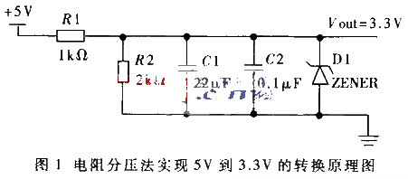 利用电阻分压的方法比较简单,其原理如图1所示。但是,该电路实际的输出电压显然要小于3.3V,并且随着负载的变化,输出电压也会产生波动。另外,这种电路的功耗也比较大。然而,其成本比较低并且结构简单,可以作为一种应急的方案。对于低功耗的系统和对电源要求高的系统,不适合采用这种方案。