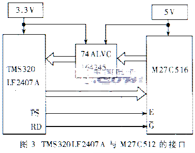 M27C516是一个32K的EPROM,可使用该器件对TMS320LF2407A的程序区进行扩展。TMS320LF2407A的VOH和VOL分别为2.4V和0.4V,而M27C516的VIH和VIL分别是2.0V和0.8V,因此从TMS320LF2407A到M27C516的单线控制线和地址线是可以直接相连的。但是LF2407A不能承受5V的电压,所以从M27C516到TMS320LF2407A的数据线不能够直接相连。解决的办法是在中间增加一个缓冲器件,如74ALVCl64245。它采用双电压供电,一边采用3.3V供电,另一边采用5V供电,因此可将3.3V的电平转换为5V的电平,相反也可以将5V的电平转换为3.3V的电平,它可以用作两个8位总线驱动器或者一个16位总线驱动器。TMS320LF2407A和M27C516通过74LVCl64245的接口示意图如图3所示。