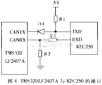 总线接口时可以采用增加缓冲器件的方式,但是对于串口的接口,没有必要增加缓冲器件,可以设计一些简单的电路来实现,如与82C250的接口。82C250是驱动CAN控制器和物理总线间的接口,提供对总线的差动发送和接收功能。TMS320LF2407A的VOH是2.4V,而82C250的VIH是3.5V以上,很明显TMS320LF2407A驱动不了82C250; 同时,82C250的VOH大于4V,而TMS320LF2407A的VIH最大为3.6V,不能承受5V的电压,因此,在TMS320LF2407A与82C250接口需要增加额外的电平转换电路。图4为一个由电阻和二极管组成的电平转换电路,在CANTX输出端,增加了一个二极管,从而使TXD接收的电压提升了0.7V;同时RXD的电平经过了两个电阻的分压,使得CANRX接收的电平可以保证在3.3V内。