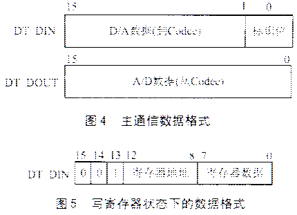 DSP对AD545控制寄存器的设置是通过串行通信来完成的。主通信在DSP和AD545的ADC通道和DAC通道之间传输实际信号数据,二次通信用来配置AD545的控制寄存器。二次通信是在主通道期间通过设置所传输到AD545中数据字的最低有效位(LSB)的值来标识的。如果LSB是1,则下一个通信周期是二次通信周期,AD545所接收到的数据就会被变换来对控制寄存器进行写入操作。
