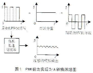 F240芯片提供的PWM输出,是一种周期和占空比均可变、幅值为5 V的脉宽调制信号。实现PWM信号到D/A转换输出的理想方法是:采用模拟低通滤波器滤掉PWM输出的高频部分,保留低频的直流分量,即可得到对应的D/A输出,如(图1)所示。低通滤波器的带宽决定了D/A输出的带宽范围。
