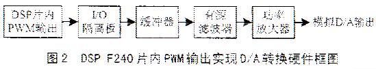 一般来说,F240的PWM输出要通过具有一阶阻容滤波及光电隔离功能的I/O接口板后,方可与实际控制对象连接。为了获得高精度的D/A输出,在滤波之前应先通过缓冲器,整体设计框图如图2所示。