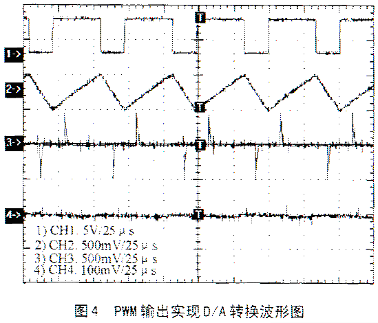 如图4所示,是在给定一恒定的3.5 V模拟电压作为F240的A/D输入的情况下,所得的PWM输出实现D/A转换的波形图。