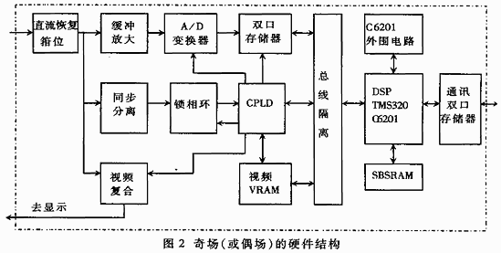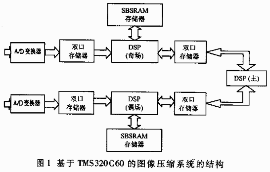 模拟视频信号经高速A/D采样后转换成数字视频信号。数字视频信号由奇数场信号和偶数场信号两路信号组成,奇数场信号和偶数场信号按照上述改进的小波压缩方案进行图像压缩。采用TI公司的含多处理单元的C6201定点处理器,该处理器可采用50MHz或100MHz的工作频率,经内部倍频后升至200MHz,每秒可完成1.6G次操作。其内部含有具备超长指令字处理能力的CPU和8个功能单元,故而它可在个时钟周期内执行8条指令,芯片运算能力显著提高,再加之其良好的外部RAM接口和16bit的主机接口以及四通道的DMA功能,就使其成为高速运算的首选芯片,该系统的硬件结构如图1所示。本系统拟采用三片C6201,一片负责奇场图像的压缩和存储,一片负责偶场图像的压缩和存储,一片主C6201负责一帧压缩图像的存储、判断和通讯,其工作原理如下: (1)待处理视频信号首先送入A/D处理模块。A/D模块由视频同步分离电路、直流恢复电路、锁相环时钟电路和高速视频模拟/数字转换器组成。待处理视频信号经同步分离电路,分离出行场同步信号和奇偶场信号,将行场同步和奇偶现场信号送给CPLD作为时间基准信号。同时,待处理视频图像信号经直流恢复电路恢复它的直流分量,再经模数转换成数字信号。 (2)转换后的数字信号先由双口存储器缓存。CPLD通过逻辑综合,为双口RAM(DPRAM)产生写入地址和读写控制信号,使得A/D变换的数据按照要求存入以口RAM中。再由2片C6x(Odd-C6x和Even-C6x)分别读取,奇场信号由Odd-C6x读取、偶场信号由Even-C6x读取。双口RAM采用16行缓存,2片C6x(Odd-C6x和Even-C6x)每隔16行读取一次。当双口RAM存完16行后,CPLD给Odd-C6x或Even-C6x发出中断信号,则Odd-C6x或Even-C6x读取已存的16行数据。 (3)当Odd-C6x或Even-C6x处理器收到CPLD发出的中断信号后,立即响应外部中断并给CPLD一个中断响应信号,CPLD通过逻辑运算将Odd-C6x或Even-C6x与DPRAM间的缓存器接通,由Odd-C6x或Even-C6x内部的DMA控制器以DMA方式将相应DPRAM内数据读入Odd-C6x或Enen-C6x并对图像数据进行压缩,将压缩后的结果存入SBSRAM,并将一些压缩参数传送给Main-C6x以便进一步分析与片。整个系统的硬件结构如图2所示。