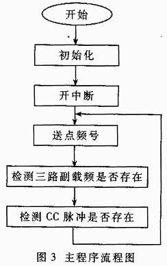 程序分为两大部分:主程序及中断服务子程序。主程序完成初始化后,等待CC同步脉冲的到来。CC同步信号连到DSP的外部中断上,当脉冲到来时,DSP响应外部中断,脉冲到来一次响应一次中断。中断服务子程序完成随机数的迭代、对比、信号的接收、译码、解密及主控机的数据传输等。主程序流程如图3所示。