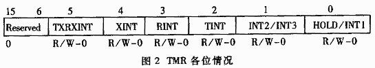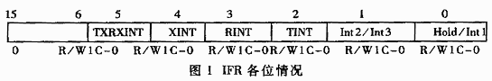 在TMS320F206的程序空间可,可断向量占据了00~3fh的位置,并且中断的优先级也是固定的,所以在编程开发时先要编好一个中断向量表,对于没有用到的中断也应该编上,并让它返回到一个空位置,以免发生意外情况。TMS320F206的中断有许多特殊的地方,如HOLD和INT1共用一个中断向量,INT2与INT3也共用一个中断向量。如果在实际应用中用到的中断比较多时,那么控制中断就是一件比较难的事,此时就要对它的三个中断寄存器灵活运用。下面就来介绍这三个寄存器。 (1)16位的中断标志寄存器(IFR),地址为0006h,各位情况如图1所示。当有一个可并蔽中断到达CPU时,IFR的相应标志位就置1,这表明相应中断正在被挂起或正在等待响应。将1写入到相应的标志位,可清除相应的位并清除其中断请求。 在图1中,0表示一般情况下读的数为0,R表示读,W1C表示写1时把这位清为0。-0表示复位后这位为0。