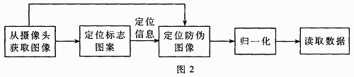 从摄像机上得到的图像,无论从几何形状(尺寸、倾斜角度)上,还是从光照度上都是不确定的。为了能够对图像进行分析,必须首先获得以上的信息,也就是说必须对图像进行定位,然后归一化到某一个确定的几何形状、光照度。在具体实现时,需要在混沌防伪图像周围设计定位符。识别过程如图2所示。 采用图像模式识别、图像定位、图像光照强度分析、图像均衡、图像放大、缩小和旋转等等图像处理技术,获取定位符的几何、光照等信息。然后根据定位符的这些信息对混沌防伪图像进行归一化处理,从而使得防伪图像具有较强的几何适应性和光照适应性,抗干扰能力强,从而大大降低了硬件的成本。 由于每条混沌轨道相对于混沌防伪图像是不确定的,图像识别、定位后,不能直接读取混沌防伪图像的数字信息,还必须采用直线拟合的方法定位每条混沌轨道(结果如图1)。把图1中的许多″毛刺″所组成的弯弯曲曲的曲线看作是一条不规则的波形。然后对它进行采样。于是可以得到以下序列: xi=x1x2x3…xi…xn (1)