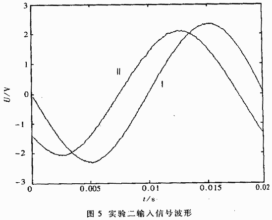 利用信号发生器产生正弦信号,叠加2.5V的直流偏移后输入到两个A/D同步采集通道(通道0和通道8),进行测量实验。信号I视为电压无功控制器待测量的电压信号;信号II视为电流信号。实验一的输入信号波形见图4,频率为50.63Hz,电压U(信号I)领先电流I(信号II)27.6度,实验结果见表1;实验二输入信号波形见图5,频率为49.69Hz,电压U(信号I)落后电流I(信号II)44.5度实验,结果见表2。 表1 实验一测量结果及分析