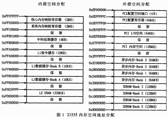 CI地址空间和I/O控制寄存器,都具有独立的地址空间。此地址空间的各部分存储器按照分级结构排列,以提供较高的性能价格比。一些快速、低延迟的存储器(如L1)的位置接近处理器核心,而低成本低性能的存储器远离核心。 芯片内部的308KB RAM中,其中L1(一级缓存)52KB,L2(二级缓存)256KB;外部地址访问空间可以高达768MB,通过EBIU(External Bus Interface Unit,外部总线接口单元)进行管理。EBIU支持多种内存,如SDRAM、SRAM、ROM、EPROM、FLASH、FIFO等。内存地址的具体配置空间如图1所示。