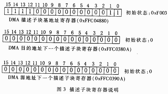 为了描述Mem DMA序列,DMA控制器使用一套名为描述子块(Descriptor)的参数。当需要后继的DMA序列时,这些描述子块被链接起来。这样,一个DMA序列完成时能够自动初始化下一个序列,并将其启动。如果不需启动下一个序列,只要将其指向一个内容为0的地址空间即可。如果下一次链接指向原描述子块,则DMA完成后暂停。为访问整个ADSP-21535的地址空间,源地址和目的地址描述子块采用了全32位地址的基指针。两个描述子块均为5个字的连续空间,需要注意的是该连续空间必须定义在L2范围内。描述子块内包含的内容如图2所示。 Mem DMA规定,描述子块所在的首地址必须传入相关的寄存器。描述子块首地址的高16位装入DMA_DBP寄存器(DMA Descriptor Base Pointer Register,DMA描述子块基地址寄存器)内。由于该寄存器严格限定必须在0xF000~0xF003,这就限定了源和目的地址描述子块只能定义在L2存储器内,并且高16位地址相同。 描述子块首地址的低16位放在两个寄存器中,源地址描述子块低16位装入MDS_DND寄存器(Source Memory DMA Next Descriptor Pointer Register,DMA源地址下一个描述子块寄存器),而目的地址描述子块低16位装入MDD_DND寄存器(Destination Memory DMA Next Descriptor Pointer Register,DMA目的地址下一个描述子块寄存器)。其说明如图3所示。 在描述子块的地址传入相应寄存器后,后面的四项先配置,然后设置第一项。也就是对管理DMA启动参数的寄存器进行参数配置。两个配置寄存器的详细内容如图4所示。例如当目的地址寄存器为0x8003,源地址寄存器为0x8001时,传输的数据总长=DMA传输的长度字。需要注意的是,虽然此时传输以16位(字长)传输,但DMA的带宽是32位,剩下的带宽资源将被浪费。8位传输时,带宽资源利用率更低。