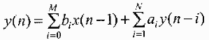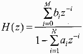 数据存储如下:H1,L1存32bit操作数;H2,L2存32bit操作数;R3,R2,R1,R0存64bit乘积 STM #L1,AR1 ;AR2→L1 STM #L2,AR3 ;AR3→L2 LD *AR2,T ;T=L1 MPYU *AR3+,A ;A=L1*L2 STL A,@R0 ;保存R0 LD A,-16,A ;A=A>>16 MACSU *AR2+,*AR3-,A;A=L1*L2>>16+L1*H2+H1*L2 MACSU *AR3+,*AR2,A;A=L1*L2>> ;16+L1*H2+H1*L2+H1*L2 STL A,@R1 ;保存R1 LD A,-16,A ;A=A>>16 MAC *AR2,*AR3,A ;A=(L1*L2+H1*H2)>>16+H1*H2 STL A,@R2 ;保存R2 STH A,@R3 ;保存R3 2 IIR滤波器的基本原理及编程实现 N级IIR滤波器的脉冲传递数表达式为
