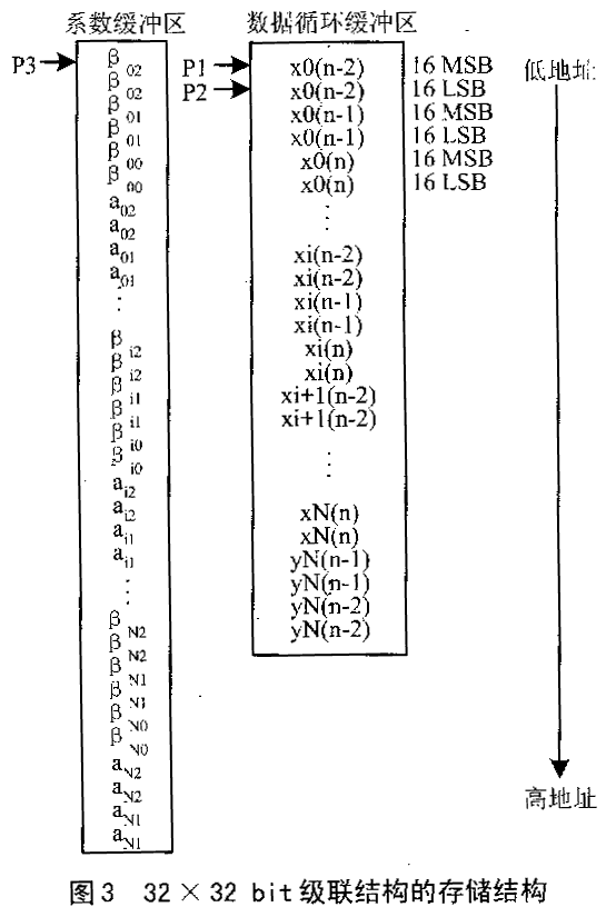 IIR滤波器的一个典型应用,就是用作均衡器。在级联型的结构中,可以用极点和零点配对的方法,把共轭的零、极点或相近的零、极点组合在一个二阶滤波器中,这对于降低有限字长系数的敏感程度十分有效。另外,交换级联次序也是减少有限字长效应的一个行之有效的方法。本文给出用二阶级联扩展精度IIR滤波器实现时域均衡器的程序。 本程序中使用了一个循环缓冲区用来存放数据,要求计算出的系数均循在-12~12dB。为了防止溢出,使最大增益为4,通常要结果右移2bit(相当于结果除4)。这样就范围变成了-24~0dB(因为20log(1/4)=-12dB)。每个滤波器的通带频率集中在某个比较感兴趣的频率段。滤波器系数的绝对值可能比1大。当用Q15格式表示时,必须除2的整次幂来满足限定的范围[-1,1~2 -15]。所以系数在存入存储器之前要右移,那么与此对应的在存入每个滤波器输出系数时要左移。32%26;#215;32bit直接II型的级联结构运算量如下:周期数为29,RAM为16字。寄存器数为6。 系数缓冲区和数据缓冲区的长度不同,且仅数据缓冲区是循环缓冲。32%26;#215;32bit级联结构的存储器结构如图3所示。