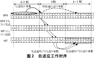 图2所示为自适应工作时序,包括两个高速用户,当基站侧在第K帧时,取得第K-2帧的9号时隙和第K-1帧的0~8号时隙的信道估计参数,通过这些参数更新信道统计信息,进行自适应计算。而计算得到的直接自适应参数用于第K+1帧的O~9号时隙的迭代干扰抵消和解码。同时,基站侧将统计信息和部分自适应控制参数分成用户1和用户2的两个部分,分别组人下行链路的空口2号和3号子时隙位置的控制数据部分,发送至移动台。移动台侧根据反馈的数据重建信道统计信息并重复部分接收端的计算过程,得到与接收端完全一致的自适应控制参数,用于控制第K+1帧O~9号时隙的数据发送。