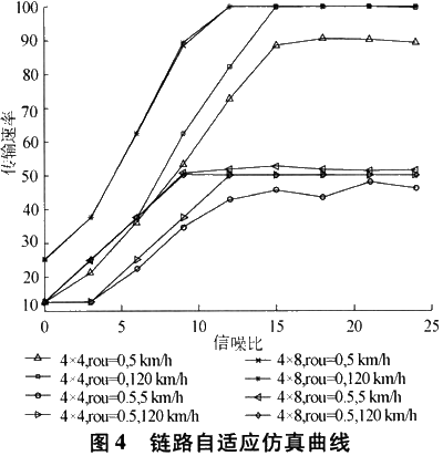 图4是仿真曲线。由图中可知,4收和8收有3 dB的差异。天线问的相关性直接影响信道独立流的个数,从而使高相关性的信道极大地降低了传输速率。5 km/s和120 knv/s的车速凸现了慢衰落和快衰落下的系统性能差异,在低车速下即使高信噪比仍然无法达到最高的传输速率。