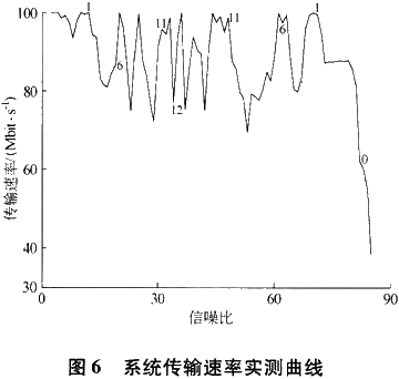 仿真表明,该自适应算法能够在大动态范围内的信道变化下自适应调节系统传输速率,保证系统高效、稳定、可靠地工作。该自适应算法的DSP实现满足实时性要求,外场实测结果是试验系统能在测试环境中正常运行,可以达到100 Mbit/s的峰值传输速率。