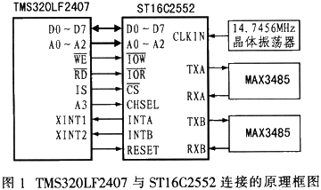 随着大规模集成电路工艺技术的迅速发展,DSP已经越来越广泛地应用于工业场合。工业现场由于许多场合通讯双方相距较远,为了保证通讯成本和可靠性,必须采用串行方式进行通讯。目前TI公司DSP都只有一个UART口,比如TMS320LF2407,当同时需要与上位机和下面的被控对象进行通讯,或者同时连接几个上位机时,则需要对DSP进行串行通讯口扩展,而使用可编程的ST16C2552可以一次扩展两组相互独立的串口,满足各种条件下串行通讯的要求。