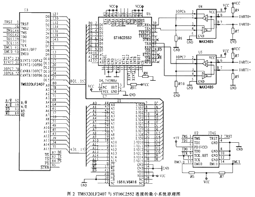 引脚CS相连。两个通道的中断引脚分别连接到DSP的外部中断引脚XINT1和XINT2。采用有源14.7456 MHz晶体振荡器为ST16C2552提供时钟频率。两组UART分别通过两个MAX3485连接到外部RS-485总线,MAX3485的使能由DSP的IOPC6和。IOPC7两引脚控制,整个系统采用3.3 V供电。图2为ST16C2552和TMS320LF172407的最小系统原理图。
