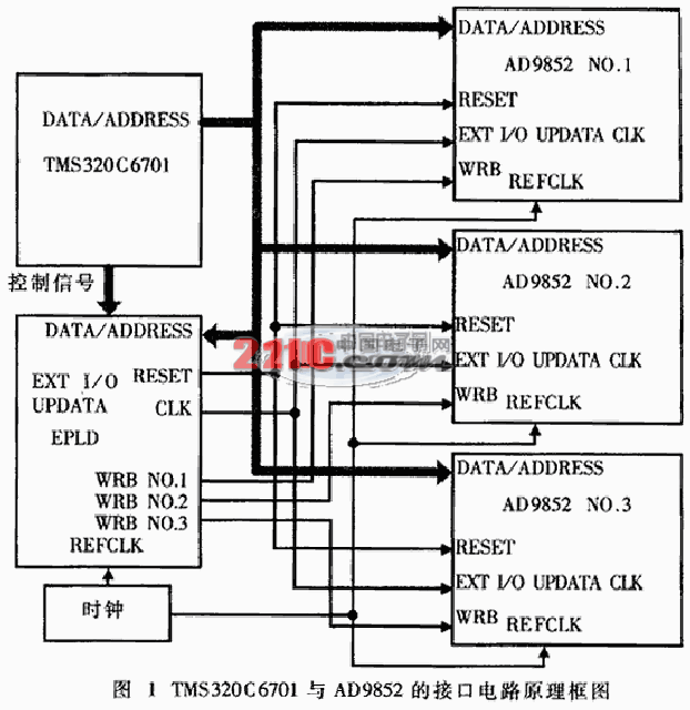 TMS320C6701还控制EPLD产生三片AD9852需要的复位信号RESET和外部更新时钟EXT I/O UPDATECLK。为了使三片AD9852和EPLD之间系统时钟同步,它们的外部参考时钟REFCLK由同一个50MHz的温补晶振提供。