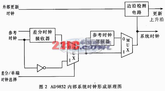 为了实现三片AD9852输出信号波形相位同步,必须保证所有的AD9852芯片在同一个系统时钟节拍下工作,每个AD9852的系统时钟之间的相位误差应该最大不超过一个周期。AD9852内部系统时钟形成原理图如图2所示。AD9852有关分或单端两种参考时钟形式,它们既可以直接形成系统时钟,又可以通过参考时钟倍频器倍频后形成系统时钟,选择哪种参考时钟和是否通过参考时钟倍频器倍频可由用户根据需要自行设置;异步的外部更新时钟经过边沿检测电路后与系统时钟同步,形成上升沿,触内部控制寄存器更新内容。从上述分析中可以看出,只有三处AD9852芯片参考时钟同步,才能避免它们系统时钟彼此之间不同步。下面介绍影响三片AD9852芯片同步工作的几个关键信号。