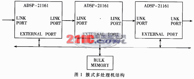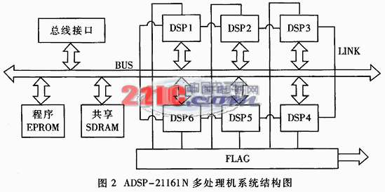 本结构采用高速浮点DSP(ADSP-21161N)。ADSP-21161集成了一个性能优良的浮点DSP核和丰富的在片功能,并且提供了实用可靠的多处理器互联及并行处理的方式。以六片ADSP-21161N构成的多处理器结构具有强大的处理能力,可以完成各种高速实时信号处理功能。