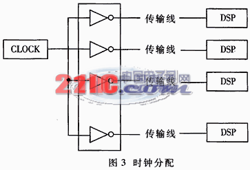 另外多处理器系统的时钟、复位步问题一个决定系统工作正常与否的关键问题,各DSP的复位信号可同时接到看门狗的输出端。时钟信号必须在阻抗可控的传输线中传输,为保证各DSP的时钟信号之间不存在相位差,或者说相位差在系统允许的范围内,一般应采取始端连接的方式。图3给出串联传线分配时钟的例子,它允许在不同的路径中存在延时,每个设备必须在线的终端。传路径必须均匀分布,以使各路径上的传输延迟相互匹配。匹配的反相器必须在同一IC上,且相互之间的时间滞后差必须小于1ns。