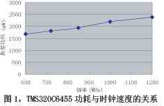 其中,Cpd为动态电容,F为开关频率,Vcc为电源电压。上述关系中包含两个重要概念:动态功耗与开关频率呈线性关系,与电源电压呈二次关系。图1列出了TMS320C6455在不同工作频率下的典型功耗。