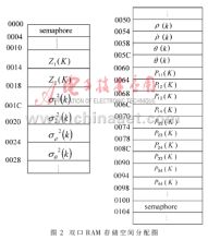 数据处理模块由双口RAM IDT7134、TMS320C31(以下简称C31)、EEROM 28F010和高速RAM CY7C199组成,通过ISA总线和主计算机连接起来,构成主从式多处理器工作模式,如图1所示。主从式处理器系统的设计关键在于处理器之间的数据交换,主从处理器间的数据交换主要有串行、并行、DMA及双口RAM四种交换方式。本方案采用IDT公司的双口RAM IDT7134实现主计算机和C31间的数据交换。IDT7134内部含有4KB的存储器资源,具有两组地址、数据总线及读写控制线。主计算机和C31可同时对其进行读写操作。在对其内部同一存储单元访问时,要考虑写入和读出数据的完整性。IDT7134没有单独的主从处理器访问控制引脚,设计时需用软件方式来保证主计算机和C31之间数据交换的正确性。本方案中采用了在IDT7134中设置输入输出semaphore的方案,即主计算机在将跟踪雷达的测量数据写入双口RAM后,设置输入semaphore,通知C31读取测量数据。C31进行卡尔曼滤波后,将滤波结果写入双口RAM,设置输出semaphore,通知主计算机读取。双口RAM的数据宽度为8位,C31数据总线宽度为32位。双口RAM的数据总线和C31低8位数据总线相接。为了提高数据处理的精度,双口RAM中的跟踪数据和C31的滤波结果都以字(32位)为单位进行存储,C31作卡尔曼滤波时,首先按字节读取跟踪数据,然后进行移位,拼接成32位整形数,再将整形数转换为浮点数,进行滤波运算。输出时,则将浮点型的结果转为整形数,按字节写入双口RAM中。双口RAM空间分配如图2所示。