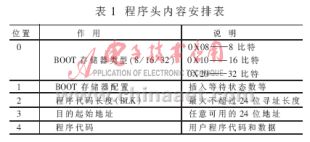 本方案中程序头配置如下:“08 00 00 00 F8 10 00 00 FF 20 00 00 00 00 10 00”,包含以下信息:①外部程序存储器宽度为8位;②EPROM需要7个等待状态;③装入的目的起始地址为0X100000;④程序代码块长度为20FF。程序头在存储器的0X400000开始存放。