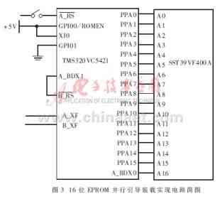 在以上四种工作方式中,最常用的是16位并行EPROM方式。即在DSP芯片上电或复位时,通过DMA通道将存储在核外EPROM中的程序以16位形式存储到核内的程序空间中。
