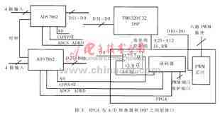系统中使用了两片ADS7862,它们的控制线使用同样的接口,数据线则分别和DSP的高/低16位数据线中的低12位相连接。这样DSP可以同时控制两片A/D转换器:4通道同时转换;每次读操作可以得到两路数据。