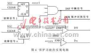 使用如图4所示的硬件逻辑来实现保护功能。当FPGA检测到相应的故障信号时,D触发器输出一个错误信号,使与门输出一个低电平,此低电平封锁住所有的PWM脉冲,并触发一个DSP的外部中断信号。当DSP响应外部中断时,可以使用PRO端口读到错误的状态位。CLEAR端口用来清除D触发器,系统因此可以重复启动。