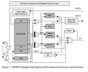 DSP强化延伸技术避免大幅变更核心成熟的五阶式管线以及Harvard记忆体架构,因此对硬体资源的冲击能够降至最低程度。此套技术并未增加暂存器或状态,也为增加对暂存器的使用限制。ARM9E系列资料路径仅增加少量的区块,包括一套高速32x16 乘数器、CLZ区块以及两组饱和运算区块。因此,ARM926EJ-S核心的运作状况与其他ARM9核心的效能息息相关(ARM9核心採用0.13微米原生型制程,提供220MHz以上的时脉速度)。