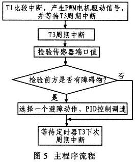小车在普通情况下(无障碍物)处于前进状态,当T3定时器发生周期中断时,进入程序开始检测光电开关的信号线端口,如果有障碍物则从避障程序中选择一个执行(左转、右转、后转),进行避障动作,如果没有障碍物则小车继续前进并且等待定时器的下一次中断,其程序流程如图5所示。